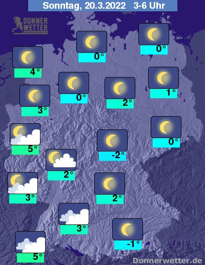 In der folgenden Nacht zeigt sich der Himmel über dem Bundesgebiet überwiegend sternenklar. Mehr und zum Teil dichte Wolken ziehen über den Südwesten und Westen des Landes hinweg. Es bleibt trocken bei Tiefstwerten von 5 Grad am Rhein und bis -2 Grad am Thüringer Wald.