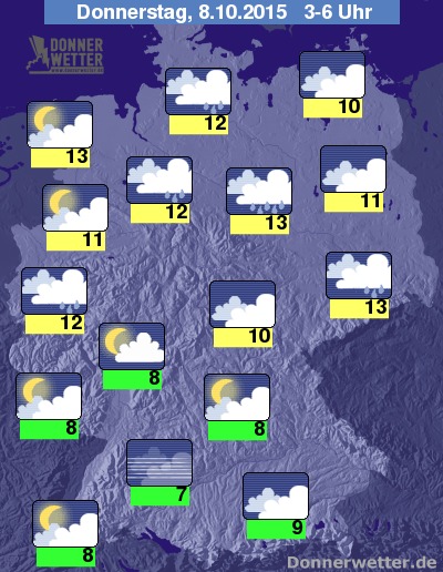 In der kommenden Nacht ist der Himmel im Süden des Landes teils aufgelockert, teils aber auch stark bewölkt, dazu fällt hier nur selten etwas Regen. Von der breiten Mitte bis nach Norddeutschland ist es dagegen überwiegend bedeckt und von Schleswig-Holstein bis nach Sachsen hinein fällt zeitweise und zum Teil auch langanhaltender Regen. Sonst fällt nur hier und da etwas Regen und oft bleibt es auch trocken. Die Temperatur sinkt auf 13 Grad in Magdeburg und bis 7 Grad in Konstanz. Im Süden bildet sich stellenweise Nebel oder Hochnebel.