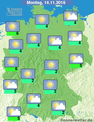 Am Montag zeigt sich das Wetter im Land überwiegend heiter bis sonnig, vor allem am Alpenrand, aber beispielsweise auch über Berlin-Brandenburg hält sich jedoch auch gebietsweise starke Bewölkung oder es ist neblig-trüb. Es bleibt im ganzen Land trocken bei Höchstwerten von 2 bis 6 Grad.