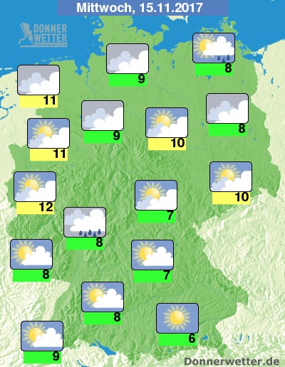 Am Mittwoch ist es im Süden zumeist heiter, vor allem am Alpenrand oft sonnig und dabei trocken. Im Norden halten sich überwiegend dichte Wolken und es fällt gebietsweise Regen. In den übrigen Landesteilen ist es teils aufgelockert, teils stark bewölkt und überwiegend trocken. Die Temperatur steigt auf 6 Grad in München und bis 12 Grad in Köln.