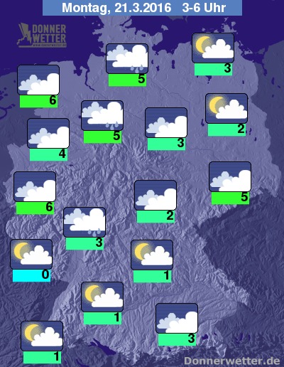In der folgenden Nacht bleibt es im Nordosten und im Süden Deutschlands bei meist nur lockeren Wolken und dabei trocken. Im restlichen Bundesgebiet ziehen hingegen weitgehend dichte Wolken durch und es ist gebietsweise auch etwas Regen oder Sprühregen möglich. Die Temperatur sinkt auf 6 Grad in Ostfriesland und bis 0 Grad am Pfälzer Wald.