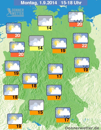 Heute Nachmittag können sich unter teils dichten Wolken vor allem im Norden, Osten und Südosten noch einzelne Schauer entwickeln, in den übrigen Landesteilen ist die Bewölkung meist aufgelockert oder es ist sogar heiter, dazu bleibt es dort auch weitgehend trocken. Die Temperaturen liegen unter den dichten Wolken in Schleswig-Holstein bei 14 Grad, in Berlin liegt die Quecksilbersäule bei etwa 22 Grad.