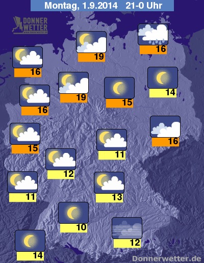 Heute Abend ziehen sich die dichten Wolken mit dem Regen meist in den Nordosten und den äußersten Osten Deutschlands zurück, sonst zeigt sich der Himmel verbreitet locker bewölkt, häufig sogar sternenklar. Dabei ist es trocken. Die Abendtemperaturen liegen bei milden 19 Grad in Hamburg und bei klarem Himmel um 10 Grad im Ries.
