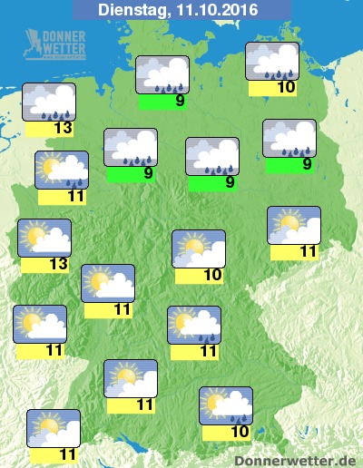 Am Dienstag ziehen über den Norden meist dichte Wolken hinweg und es fällt gebietsweise Regen. Über der Landesmitte bis in den Süden ist es teils nur locker, jedoch vor allem nach Südosten hin auch oft stärker bewölkt, dazu sind einzelne Schauer möglich, sonst bleibt es aber weitgehend trocken bei Höchstwerten von 9 bis 13 Grad.