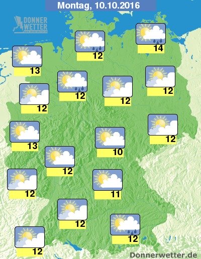 Die neue Woche startet verbreitet mit recht freundlichem, ruhigem und trockenem Herbstwetter. Dabei zeigt sich ein Mix aus Sonne und meist einigen, eher lockeren Wolken. Im Norden sind bei dichten Wolken jedoch einzelne Schauer möglich. Es werden 10 bis 14 Grad erreicht.