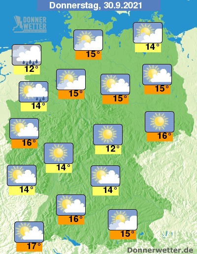 Am Donnerstag ist es zunächst vor allem über der Südosthälfte des Landes noch lange heiter bis sonnig. Im weiteren Verlauf ziehen von Nordwesten her jedoch zunehmend Wolken heran, die nachfolgend zuerst im Nordwesten, abends auch im Norden und Westen Regen bringen. Die Höchstwerte erreichen 12 Grad an der Nordsee und bis 17 Grad im Breisgau.