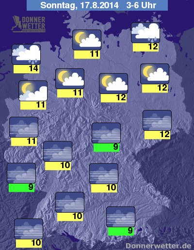 In der Nacht ist es besonders in der Südhälfte des Landes häufig klar, stellenweise ist es aber auch neblig oder neblig-trüb. Im Küstenumfeld bringen dichte Wolken gebietsweise Regen, sonst bleibt es bei meist aufgelockerter Bewölkung trocken. Die Temperatur sinkt auf 14 Grad am Dollart und kühle 9 Grad am Saar-Nahe-Bergland.