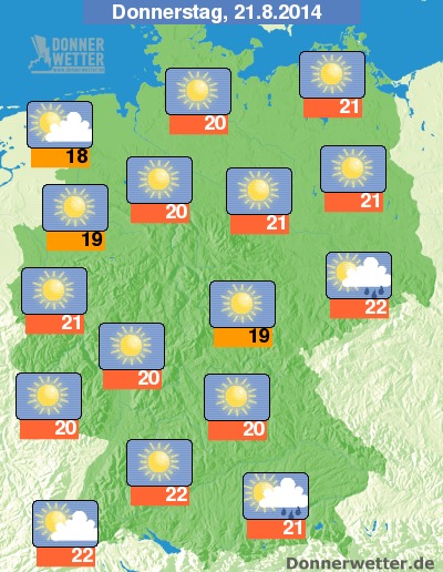 Für den Donnerstag können wir endlich wieder reichlich Sonnenschein prognostizieren. Es wird verbreitet ein freundlicher und trockener Tag mit spätsommerlichen Temperaturen zwischen 18 Grad an der Nordsee und 22 Grad im Oberrheingraben. Nur Richtung Erzgebirge, Bayerischer Wald und im Nordseeumfeld sind vereinzelte Schauer möglich.
