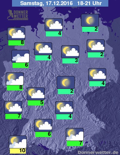 Heute Abend zieht meist nur lockere, hier und da auch noch aufgelockerte Bewölkung durch, vor allem im Nordwesten halten sich aber auch oft dichte Wolken, die jedoch nur selten etwas Regen bringen. Die Abendwerte liegen bei 2 bis 10 Grad.