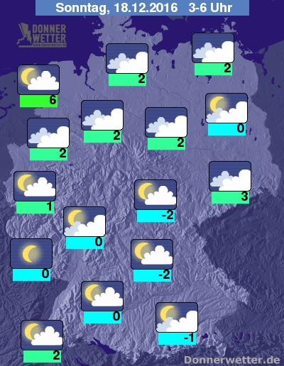 In der Nacht zum Sonntag bleibt es über der Südhälfte des Landes verbreitet nur locker bewölkt, gebietsweise wird es hier sternenklar. Über dem Norden hält sich dagegen eine mehrheitlich geschlossene Wolkendecke aus der es hier und da auch etwas tröpfeln kann. Die Temperatur sinkt auf 6 Grad in Emden, sonst auf 3 Grad in Dresden und bis -2 Grad in Unterfranken.
