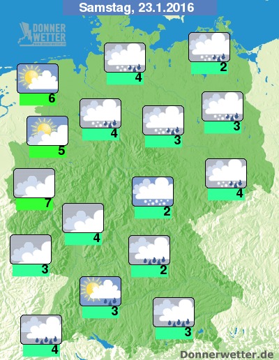 Am Sonntag weitgehend dichte Wolken, anfangs trocken, im Norden und Westen, später auch im Osten aufziehender Regen, im Süden weitgehend trocken, 2 bis 6 Grad.