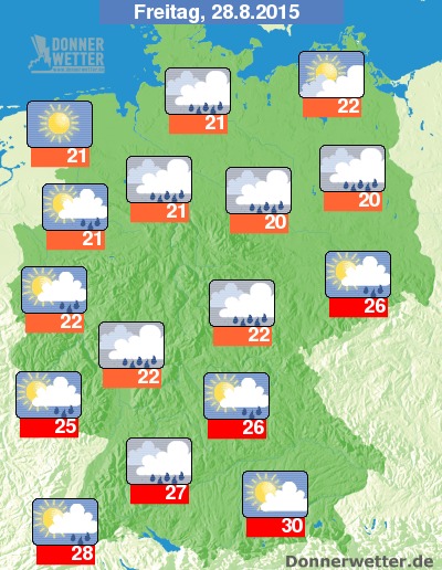Die Temperaturen erreichen Werte von 20 Grad C in Sachsen-Anhalt bis zu 30 Grad C in Oberbayern.