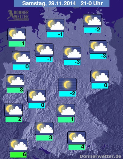 Am Abend ist es in der Mitte des Landes oft sternenklar, sonst ist es meist gering oder locker bewölkt, im Süden gebietsweise auch mal stärker bewölkt, dazu bleibt es aber trocken. Die Abendtemperatur liegt bei 6 Grad in Freiburg und etwa -3 Grad an der Müritz.