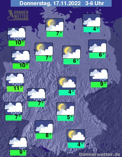 In der Nacht zum Donnerstag fällt im Osten noch gebietsweise Regen, sonst ist es teils stark, teils aufgelockert bewölkt und zunächst meist trocken. Im Westen zieht jedoch erneut ein Tiefausläufer mit zeitweiligem Regen durch, der bis zum Morgen etwa bis zur Landesmitte vorankommt. Über der Osthälfte bleibt es dann noch weitgehend trocken. Die Temperatur sinkt auf 11 Grad in Köln und etwa 4 Grad in Jena. Im Norden ist es teils, an der Ostsee verbreitet stürmisch. An der Nordsee herrscht meist Sturm.