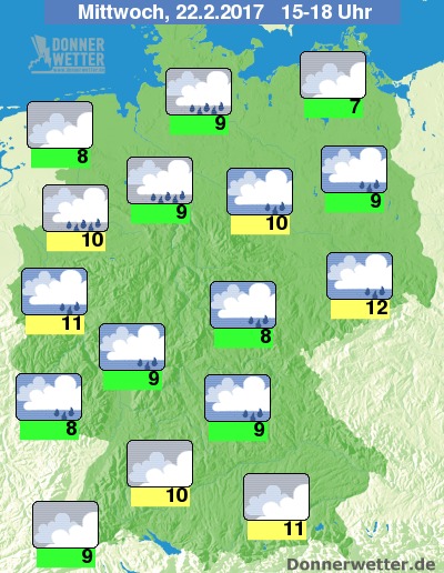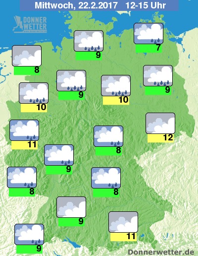 Grau und nass zeigt sich das Wetter heute Mittag und auch am frühen Nachmittag. Über dem ganzen Land liegt eine dichte Wolkenschicht und in der Mitte des Landes kommt es immer wieder zu Schauern. Im Norden regnet es häufig. Im Süden ebenfalls bedeckter Himmel, aber es bleibt mit nur wenigen Schauern überwiegend trocken.