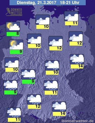 Heute Abend bleibt die Südosthälfte der Republik größtenteils verregnet. Auch weiter nach Nordwesten ist es meist stark bewölkt, jedoch bereits trocken. Oft locker oder aufgelockert bewölkt und dazu trocken bleibt es vom Emsland bis zur Nordsee. Die Abendwerte liegen bei 8 Grad im nördlichen Emsland und 14 Grad in München.