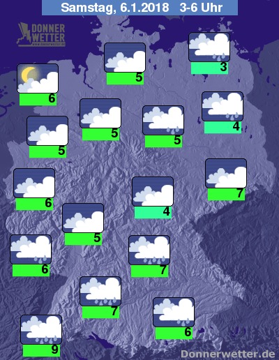 In der Nacht zum Samstag lockert es an der Nordsee zeitweise auf, sonst bleibt es jedoch bei weitgehend bedecktem Himmel und vor allem im Süden fällt zeitweise Regen. Ein Regengebiet zieht im Nachtverlauf auch über den Norden und Nordosten Deutschlands hinweg, sonst bleibt es aber meist trocken. Die Temperatur sinkt auf milde 9 bis 3 Grad.