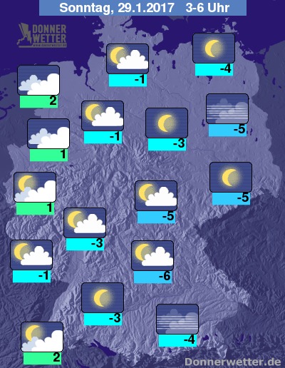 Am Sonntag ist es über der Südosthälfte Deutschlands verbreitet heiter bis sonnig und dazu trocken. Im Norden und Westen ziehen dagegen gebietsweise auch einige Wolken durch. Oft dichte Wolken ziehen vom Emsland bis zum Nordseeumfeld hin auf, hier fällt auch zum Teil Regen, sonst bleibt es hingegen trocken. Die Temperatur erreicht 2 bis 6 Grad.