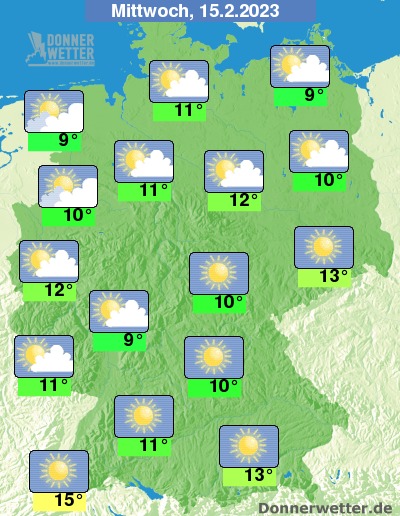 Am Mittwoch ist es oft heiter bis sonnig, gebietsweise ziehen auch einige Wolken durch. Es bleibt trocken bei Höchstwerten von 9 Grad in Neubrandenburg und bis zu 15 Grad in Freiburg.