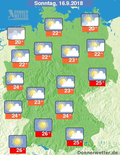 Am Sonntag ist es zum Großteil heiter oder sonnig, besonders im Norden, aber auch im Nordwesten ist es oft auch wechselnd und zum Teil stark bewölkt. Im übrigen Bundesgebiet ziehen aber nur selten dichtere Wolken durch. Es bleibt landesweit trocken. Die Temperatur steigt auf 20 Grad entlang der Küsten und bis 26 Grad m Oberrheingraben.