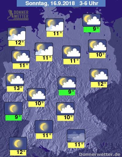In der kommenden Nacht zeigt sich der Himmel über dem Süden des Landes weitgehend sternenklar, im übrigen Bundesgebiet ist es locker bis aufgelockert bewölkt, dazu bleibt es überall trocken. Die Temperatur sinkt auf 13 Grad im Rheinland und bis 9 Grad an der Müritz.