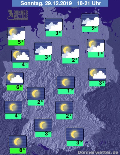 Heute Abend bleibt der Norden meist unter dichten Wolken, während über der Südhälfte ein verbreitet sternenklarer Himmel herrscht. Die Temperatur liegen anfangs noch bei 1 bis 8 Grad C.
