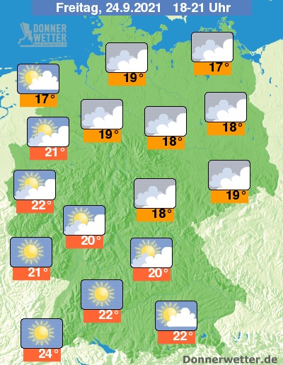 Heute Abend ist es im Norden und Osten noch verbreitet stark bewölkt, hin und wieder kann es hier aber auch auflockern. Im übrigen Land scheint häufig die Sonne, im Süden und Südwesten ist es sogar weitgehend sonnig. Es bleibt landesweit trocken bei Werten von 17 Grad an der Ostsee und bis 24 Grad im Breisgau.