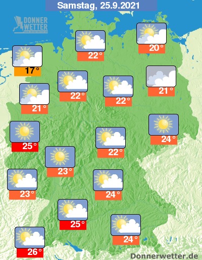 Am Samstag zieht im Norden oft dichte, zum Teils auch aufgelockerte Bewölkung durch. Im übrigen Bundesgebiet ist es vielerorts heiter bis sonnig, hier und da ziehen aber auch einige Wolken durch. Es bleibt landesweit trocken bei Höchstwerten von 17 Grad in Bremerhaven und bis 26 Grad in Freiburg.