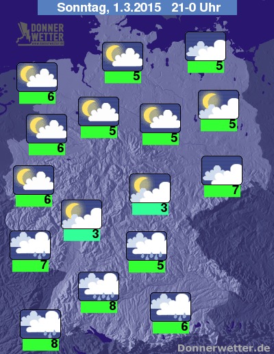 In der Nacht zum Montag bleibt es im Süden meist stark bewölkt bei gebietsweisem Regen, in den anderen Landesteilen ist es zunächst aufgelockert oder stark bewölkt und weitgehend trocken. Ab der zweiten Nachthälfte ziehen von Südwesten her dichte Wolken und teils kräftiger Regen auf, bis zum Morgen erreicht der Regen auch den Norden und Osten des Landes. Die Tiefstwerte liegen bei 8 Grad in Freiburg und bis 2 Grad an der Mecklenburger Seenplatte. Es weht verbreitet frischer und teils starker Wind, an den Küsten und auf den Hochlagen der Mittelgebirge weht der Wind teils stürmisch, dabei sind einzelne Sturmböen möglich.