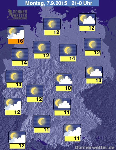 Heute Abend sind vor allem am Alpenrand noch oft dichtere Wolken unterwegs, die jedoch kaum Regen bringen. Im großen Rest des Landes zeigt sich ein überwiegend sternenklarer und sonst nur locker bewölkter Himmel, dabei bleibt es trocken. Die Abendtemperatur liegt bei 16 Grad in Emden und etwa 10 Grad im Vogtland.