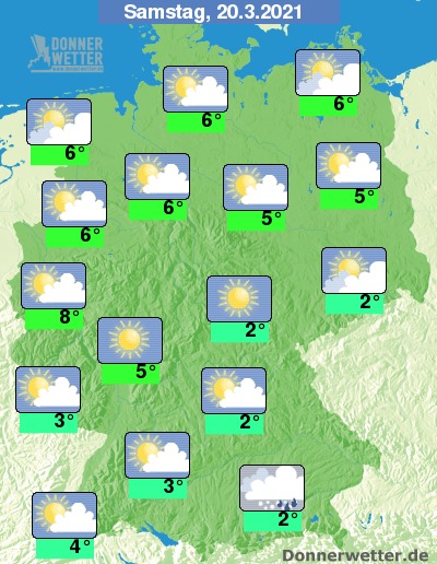 Am Samstag ist es im Norden überwiegend stark, teils auch aufgelockert bewölkt. Im Südosten ist es bedeckt und es bilden sich mögliche Schneeschauer. Im großes Rest des Landes ist es teils heiter, teils stark bewölkt, dabei bleibt es trocken. Die Temperatur steigt auf 2 Grad in Erfurt und bis 8 Grad in Bonn.