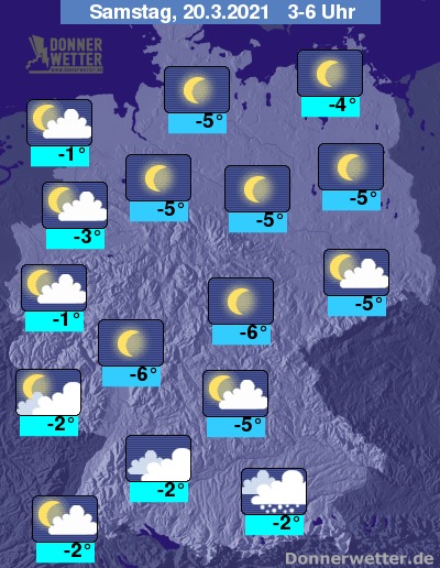 In der Nacht klart der Himmel mit Ausnahme des Südens verbreitet auf oder es ziehen noch lockere Wolkenfelder durch. Im Süden fällt unter oft dichten Wolken noch gebietsweise Schnee, sonst bleibt es trocken. Die Temperatur sinkt auf -1 Grad an der Nordsee und bis -6 Grad am Thüringer Wald.