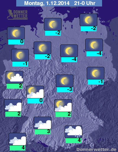 In der Nacht zum Dienstag bleibt es im Süden weitgehend bedeckt und es fällt gebietsweise auch Regen, weiter nach Norden ist es dagegen vielfach sternenklar und es bleibt trocken. Hier und da ziehen mal ein paar lockere Wolken durch. Es bildet sich jedoch stellenweise Nebel oder Hochnebel. Die Temperatur sinkt auf teils 4 Grad am Alpenrand und auf mäßig frostige -6 Grad im Havelland.