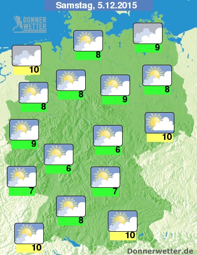 Am Samstag bleiben die Wolken im Norden überwiegend dicht, dabei sind dennoch einzelne Auflockerungen möglich, im großen Rest des Landes gibt es einen Wechsel aus aufgelockerten und teils auch dichten Wolken. Längere Aufheiterungen sind vor allem im Süden möglich, dazu bleibt es bundesweit trocken. Die Temperatur steigt auf 6 Grad am Westerwald und bis auf etwa 10 Grad im Breisgau. Im Umfeld von Nord- und Ostsee herrscht oft Sturm, vor allem an der Nordsee sind dabei auch orkanartige Böen möglich, sonst weht im Norden des Landes ein teils starker und in Böen teils stürmischer Wind.