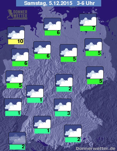In der folgenden Nacht ziehen meist dichte Wolken durch, gebietsweise zeigt sich der Himmel jedoch auch mal aufgelockert bewölkt. Nur im Norden sind hier und da ein paar Regentropfen möglich, sonst bleibt es landesweit trocken. Die Temperatur sinkt auf 10 Grad in Emden und bis etwa 1 Grad in Konstanz. Über der Südhälfte des Landes und hierbei vor allem im Süden selbst bildet sich stellenweise Nebel oder Hochnebel, dabei ist auch teils Glätte möglich. Im Umfeld der Nordsee herrscht verbreitet Sturm und es sind schwere Sturmböen zu erwarten, auch an der Ostsee und auf den norddeutschen Bergen weht der Wind oft stürmisch, im norddeutschen Flachland verbreitet stark mit stürmischen Böen.