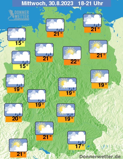 Am Donnerstag ist es vor allem im Norden zumeist stark bewölkt mit zeitweiligen Schauern, örtlich sogar Gewittern. Weiter nach Süden hin zeigt sich die Sonne häufiger, hier sind nur vereinzelte Schauer zu erwarten. Die Temperatur erreicht 17 Grad in Jena und bis 21 Grad in Freiburg.