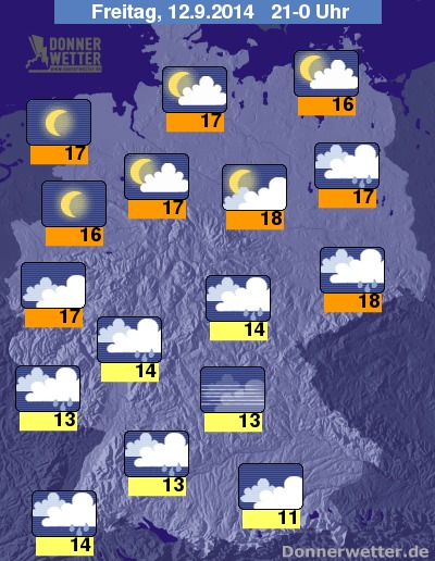 In der Nacht zum Samstag ist es vor allem im Osten, aber auch im Süden meist stark bewölkt oder bedeckt, dabei bilden sich im Osten teils gewittrige Schauer, im Süden fällt nur gelegentlich weiterer Regen, häufig bildet sich Nebel oder Dunst. Im Norden und Westen ist es meist locker bewölkt oder klar, auch hier bildet sich stellenweise Nebel. Die Temperatur sinkt auf 16 Grad in Rostock und etwa 8 Grad in Landshut.