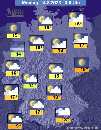In der kommenden Nacht halten sich im Süden oft kompakte Wolken und es können sich vielerorts Schauer, hier und da auch Gewitter entwickeln. Im übrigen Land ist es zumeist locker bewölkt oder sternenklar, hier und da sind mehr Wolken unterwegs, dazu bleibt es trocken. Die Temperatur sinkt auf 19 Grad in Freiburg und etwa 14 Grad in Münster.