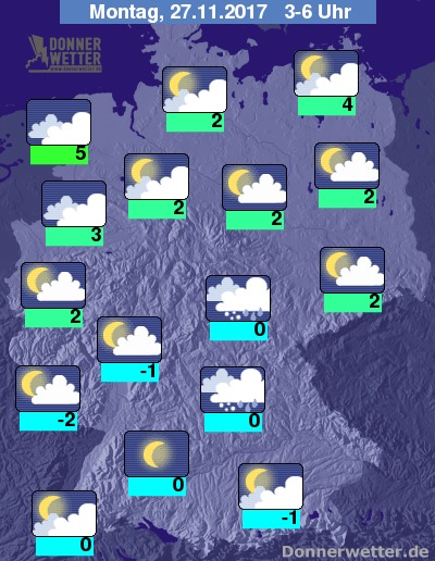 In der bevorstehenden Nacht ziehen dichte Wolken mit etwas Regen, Schneeregen oder Schnee vom Nordwesten bis in den Südosten Deutschlands. Stellenweise besteht Glättegefahr! Nordöstlich und südwestlich davon zeigt sich der Himmel jedoch größtenteils nur locker bewölkt, zum Teil sogar sternenklar und dazu trocken. Die Temperatur sinkt auf 5 bis -2 Grad.