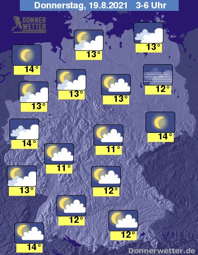 In der folgenden Nacht ist der Himmel überwiegend locker bewölkt oder sogar sternenklar. Gegen Morgen können hier und da mehr Wolken durchziehen, dazu bleibt es aber trocken. Die Temperatur sinkt auf 14 Grad im Rheinland und etwa 11 Grad im Vogtland.