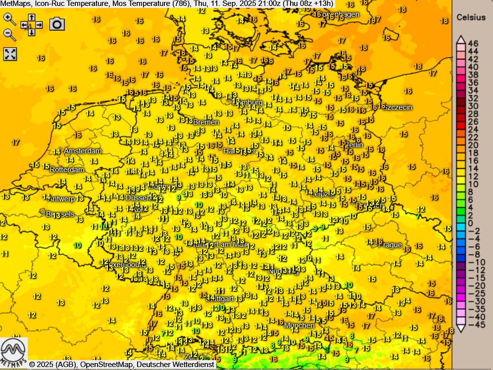 Am Donnerstagabend bleibt der Himmel meist wechselnd oder stark bewölkt, dabei ziehen von Westen weiterhin lokale Schauer durch. Im Westen, Nordwesten und im Osten können auch einzelne Gewitter nicht ausgeschlossen werden.