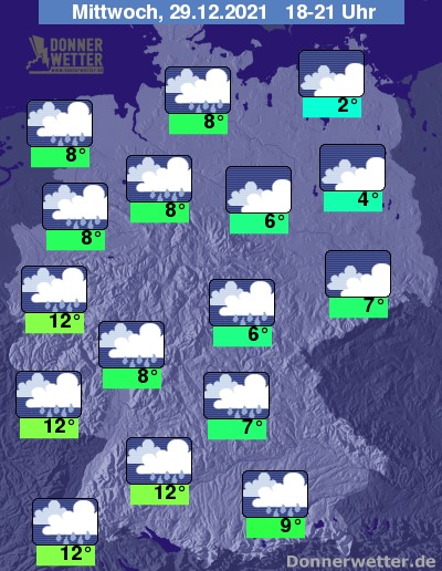 Heute Abend ist es weiterhin dicht bewölkt, dabei bleibt es im Osten und Nordosten weitgehend trocken. Im übrigen Bundesgebiet fällt verbreitet immer wieder Regen. Die Temperatur liegt teils nur bei 2 Grad in Vorpommern, aber bei etwa 12 Grad in den westlichen und südwestlichen Landesteilen.
