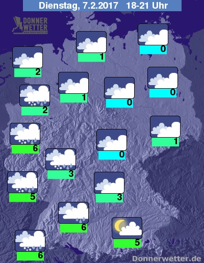 Heute Abend ziehen im Westen und Südwesten kompakte Wolken mit Regen oder Schneeregen heran. Auch im übrigen Bundesgebiet bleibt der Himmel weitestgehend dicht bewölkt, dabei bleibt es jedoch meist trocken. Die Abendwerte liegen zwischen 0 Grad in Berlin und 6 Grad in Freiburg.