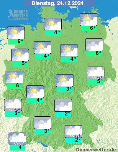 Am Heiligabend ist es über dem Land verbreitet stark, vor allem im Norden und Westen zumindest teilweise auch mal aufgelockert bewölkt. Im Süden und über Sachsen fällt anfangs noch etwas Schnee oder Schneeregen, sonst bleibt es jedoch meist trocken. Die Temperatur erreicht teils 0 Grad an den Alpen und bis etwa 6 Grad im Rheinland.