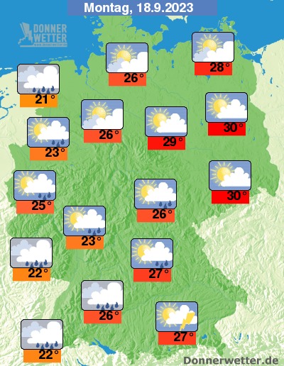 Heute bleibt es im Osten und Nordosten anfangs noch meist heiter und trocken. Im übrigen Bundesgebiet ziehen von Südwesten her oft viele und auch dichte Wolken durch, dabei bilden sich im Tagesverlauf einzelne Schauer, örtlich auch Gewitter. Die Temperatur steigt auf 21 Grad an der Nordsee und bis 30 Grad an der Neiße.