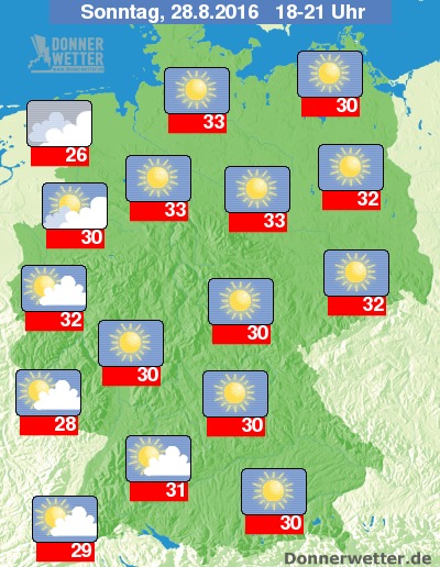 durch und es sind gebietsweise Schauer und einzelne Gewitter möglich, sonst bleibt es weitgehend trocken. Die Temperatur liegt noch bei etwa 26 Grad an der Nordseeküste und um 33 Grad in Göttingen.