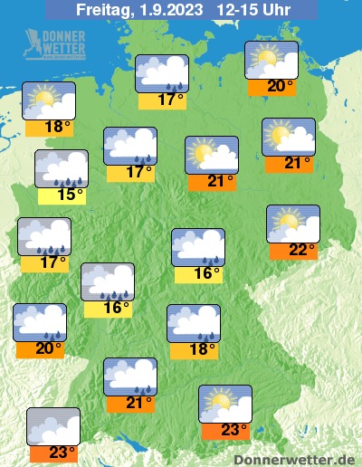 Heute Nachmittag kann sich die Sonne vor allem im äußeren Süden, an den Küsten und im Osten des Landes häufiger zwischen den Wolken zeigen, hierbei bleibt es meist trocken. Im übrigen Bundesgebiet ziehen dagegen überwiegend kompakte Wolken durch und es fällt auch zeitweise Regen. Die Temperatur liegt bei 16 Grad im Eichsfeld und 23 Grad im Breisgau.