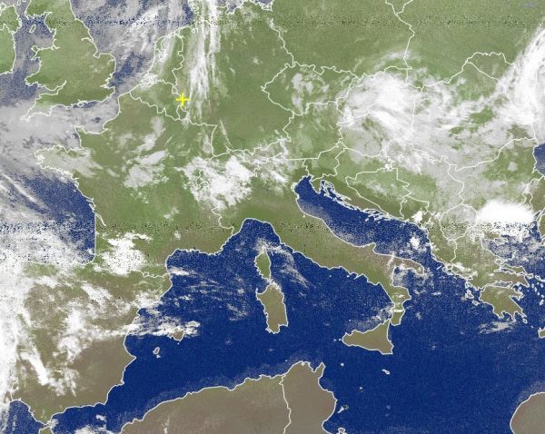 Auf dem Satellitenbild von heute Vormittag ist über dem Westen und Norden Deutschlands dichte Bewölkung zu sehen. Es fallen immer wieder Schauer. Große Gewittertürme liegen über der Slowakei und Ungarn und dem westlichen Alpenraum.