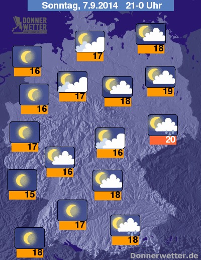 Heute Abend konzentrieren sich die Gewitter auf einen breiten Streifen vom Stettiner Haff, über das östliche Brandenburg, Sachsen bis nach Bayern, weiter westlich ist der Himmel zunehmend klarer. In der Westhälfte ist es verbreitet sternenklar und trocken. Die Abendwerte liegen bei 20 Grad in der Lausitz und ebenfalls milden 15 Grad in Saarbrücken.