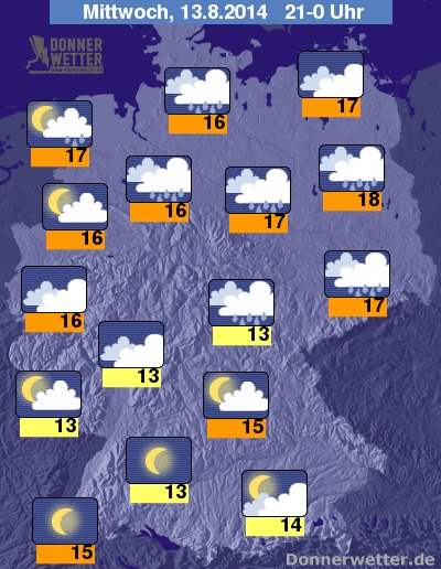 Heute Abend zieht sich der Regen meist in die Osthälfte des Landes zurück, hier fällt noch zeitweise oder gelegentlich Regen, weiter nach Westen ist es teils aufgelockert, teils auch noch stark bewölkt, aber es bilden sich nur noch vereinzelt Schauer. Die Abendtemperatur liegt bei 18 Grad in Potsdam und 13 Grad am Odenwald.